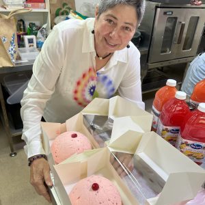 Pink food – ranging from salmon mornay to pink donuts, watermelon and feta salad, and a pair of breast-shaped cheesecakes – was the order of